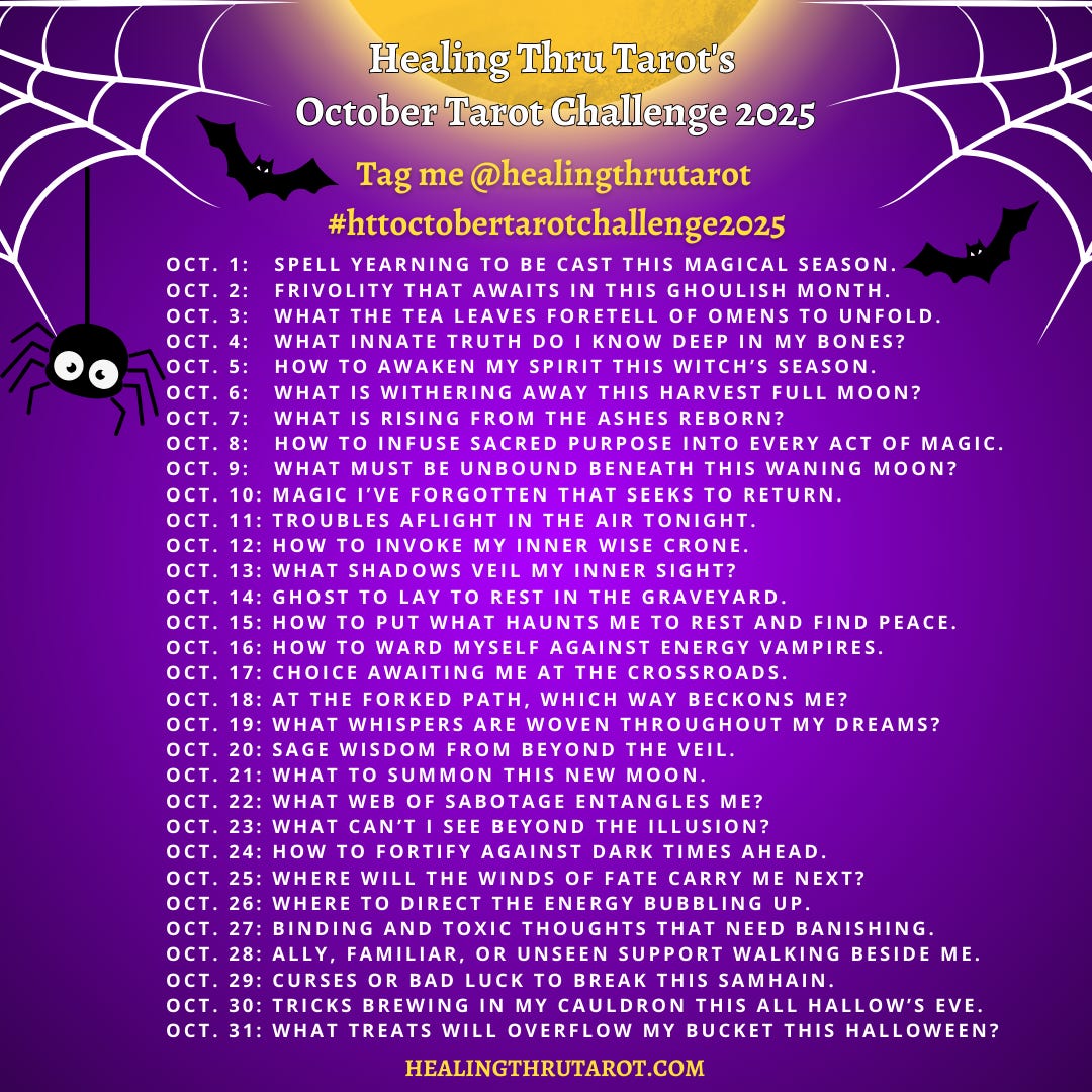 We started my Healing Thru Tarot October 2025 Tarot Challenge on Oct. 1st, but it is not too late to jump on in and join us for this month-long divination challenge.