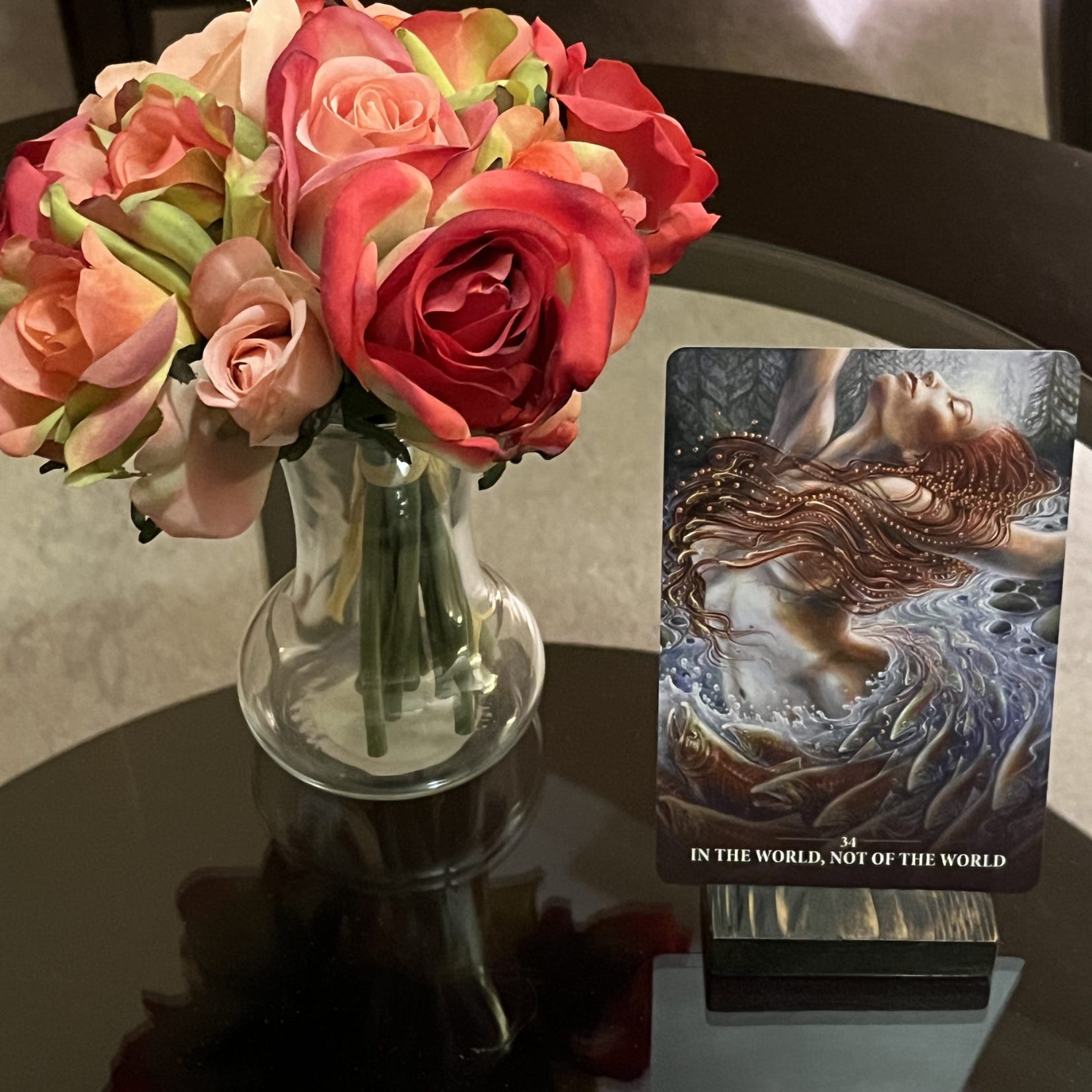 I closed this reading with an oracle card pull from the Sacred Rebels Oracle. I asked for a card to sum up this whole reading. I pulled the “In the world, not of the world” card. There was some nudity on this card. I did my best to blur it using Canva. Sigh.