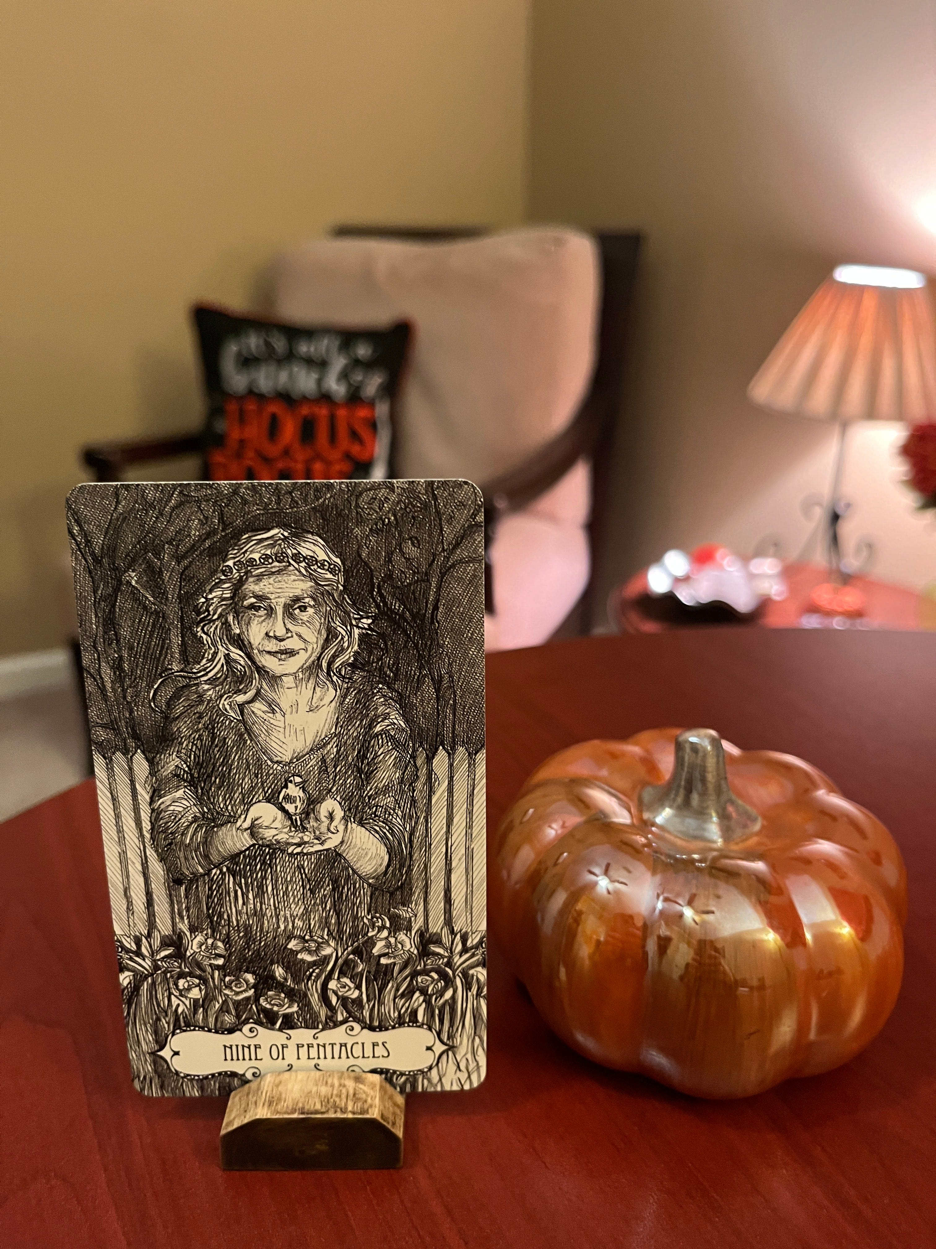 The guidebook for this card (9 of Pents) says, “This woman has earned the right to be exactly who she chooses to be. Hers is not so much a material wealth but a spiritual one. She is not afraid of what tomorrow will bring.”
